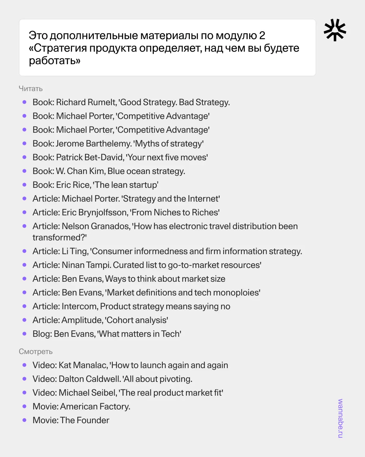 Что ещё было полезно: в каждом модуле список дополнительных материалов, которые помогают глубже погрузиться в тему. Вот, например, по стратегии — и это не полный список: