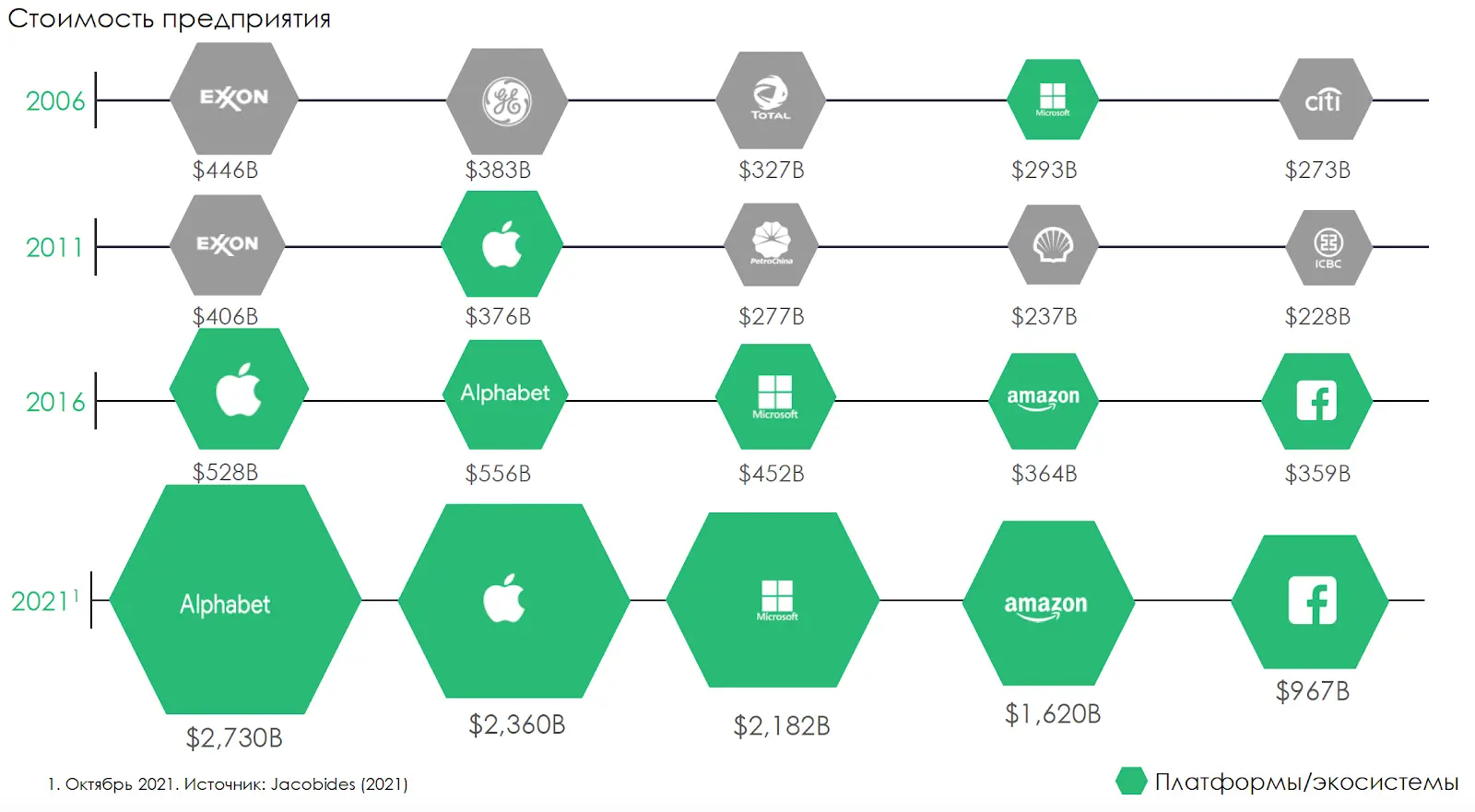 Ключевым поворотным моментом в эволюции экосистем стал период 2010-х годов, когда ведущие позиции по рыночной капитализации (стоимости компаний) были захвачены IT-гигантами, отодвинув на второй план традиционные нефтегазовые и FMCG-компании. В 2016 году список пяти самых крупных фирм мира перестал включать в себя традиционные энергетические компании и банки, такие как Exxon и GE, а также крупнейшие промышленные конгломераты вроде PetroChina и ICBC. Вместо них на передний план вышли технологические гиганты в лице Facebook, Google и Amazon.