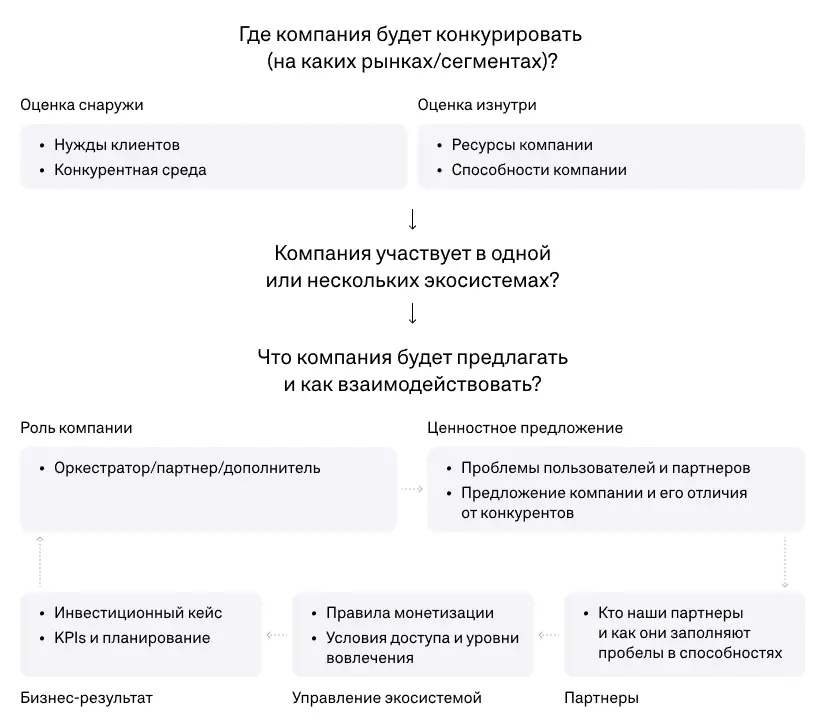 В результате данного анализа компания должна определить, где она будет конкурировать (на каких рынках/сегментах)? Какого масштаба предполагается экосистема и в чем будет ее уникальность? Какой должна быть структура — широкой с множеством предложений или сфокусированной на узкой нише? Кроме того, в результате 1-го и 2-го шагов определяется вид экосистемы — компания планирует сосредоточиться на расширении и интеграции собственных продуктов и услуг (мультипродуктовая система) или в результате анализа стало понятно, что ей необходимы партнерства и требуется создание многоакторной системы.