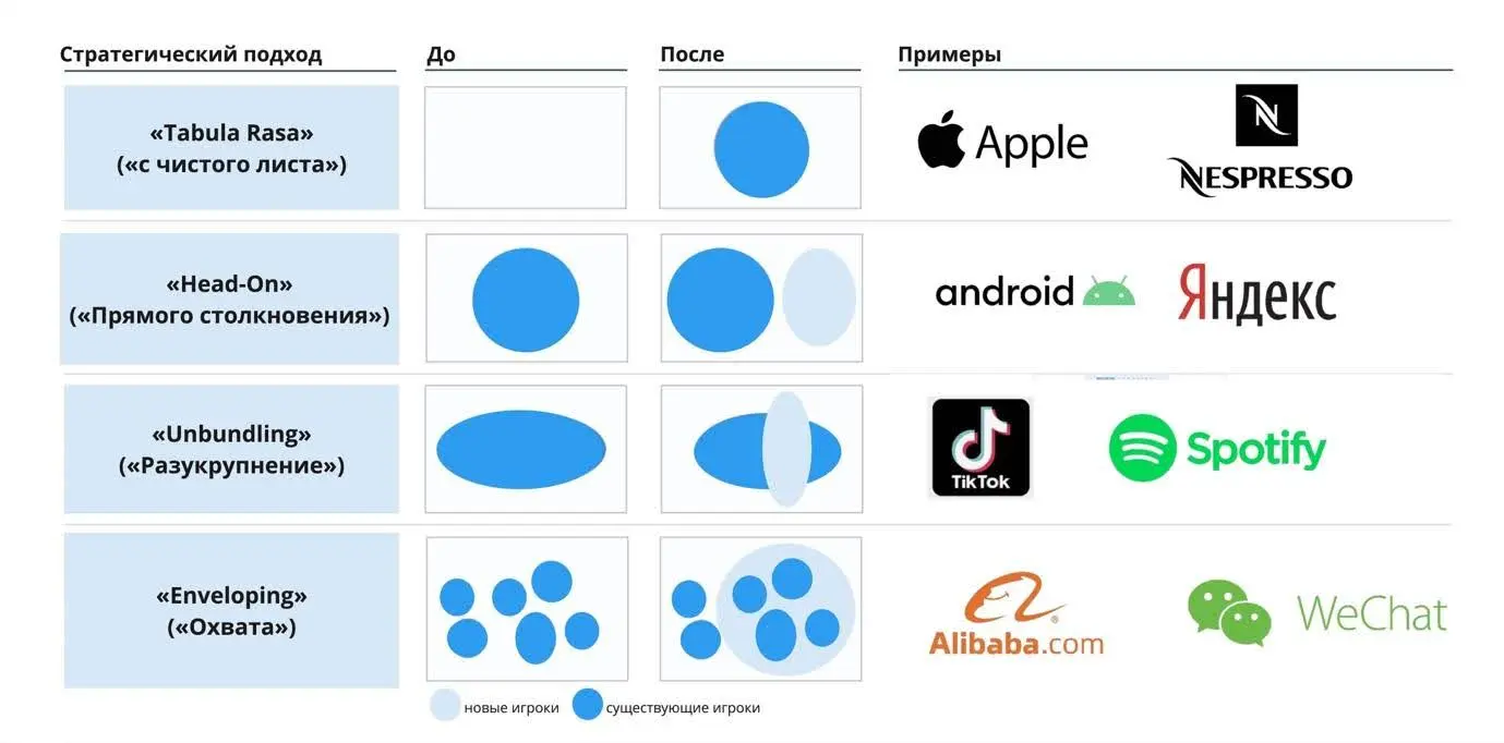 - Стратегия Tabula Rasa («С чистого листа») подразумевает создание совершенно новой экосистемы, в которой компания становится первопроходцем в своем сегменте, подобно тому, как Apple запустила App Store.