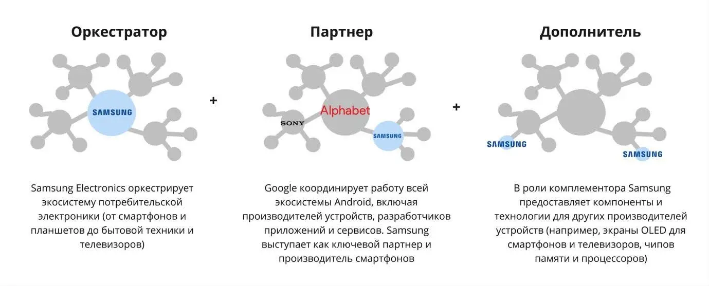 Компания может выступать в разных ролях в разных экосистемах. Рассмотрим пример Samsung.