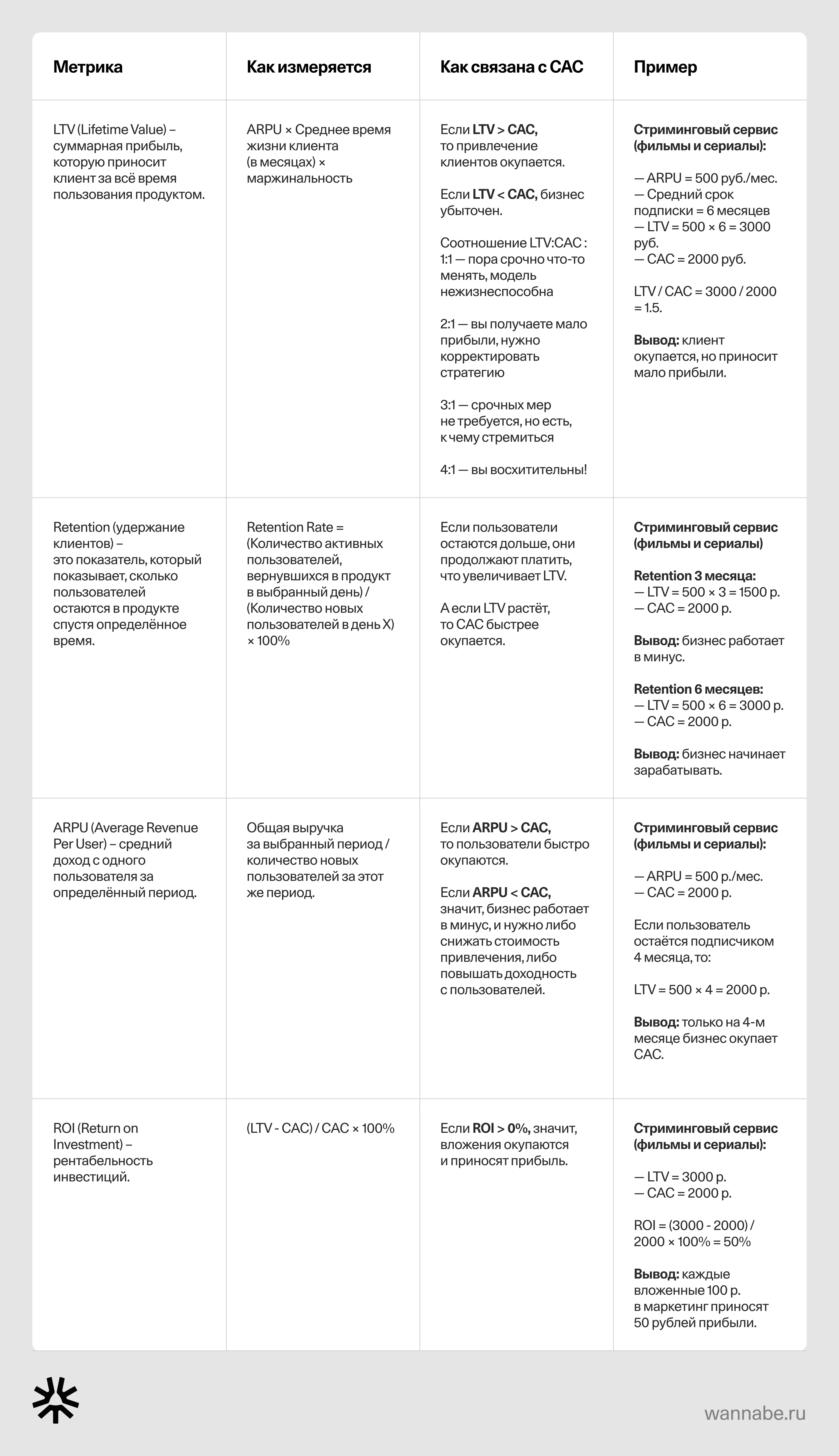 CAC не даёт полной картины сам по себе. Нужно смотреть, насколько он окупается через LTV, какой доход генерирует пользователь через ARPU, и насколько эффективно компания вкладывает деньги в привлечение (ROI).