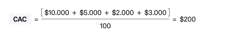Предположим, компания потратила $10 000 на рекламную кампанию, $5 000 на зарплаты сотрудникам маркетингового отдела, $2 000 на программное обеспечение для автоматизации маркетинга и ещё $3 000 на другие сопутствующие расходы. Всего было привлечено 100 новых клиентов. Тогда CAC этой кампании составит $200.