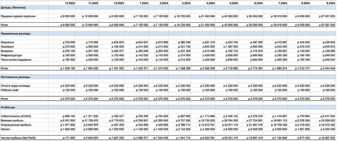 О финансах. Было очень страшно на входе, так как я любила прикрываться фразой «я гуманитарий», чтобы не разбираться в цифрах. На выходе я с легкостью составила P&L своего продукта, на который до сих пор нет-нет да зайду полюбоваться. Полюбуйтесь и вы (все цифры взяты с потолка, коммерческая тайна в безопасности)