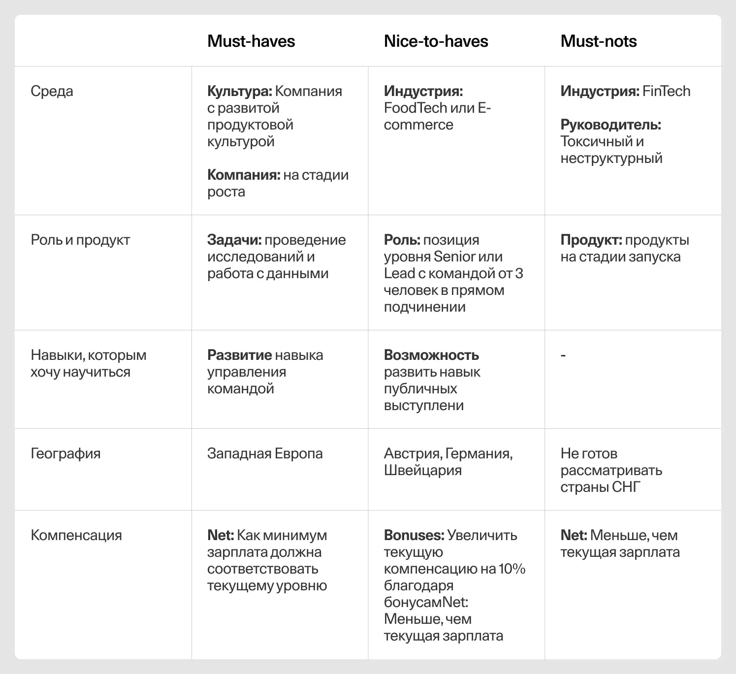 Мы предлагаем разделить критерии на три категории, используя модифицированный фреймворк из книги Harvard Business Review HBR Guide to Your Job Search.