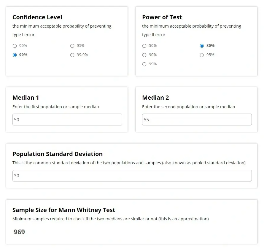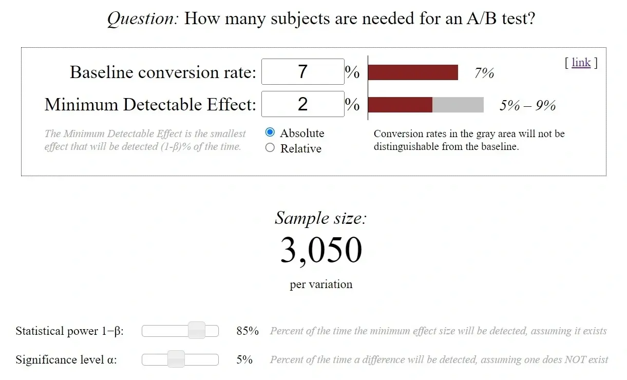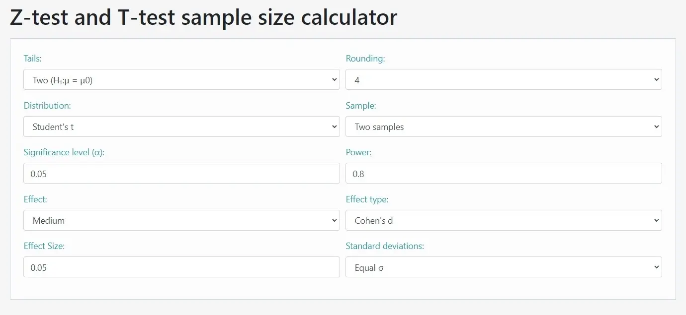Так как мы определились с критериями точности теста, теперь можем определить размеры выборок, используя эти вводные. Для этого воспользуемся калькулятором Evan Miller: