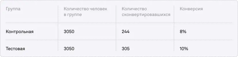 - Тестовая группа (B) — конверсия = 10%