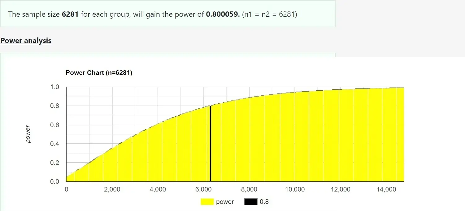 Видим, что для проведения теста нам потребуется 3050 человек в каждой группе. Всего — 6100 пользователей.