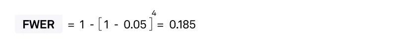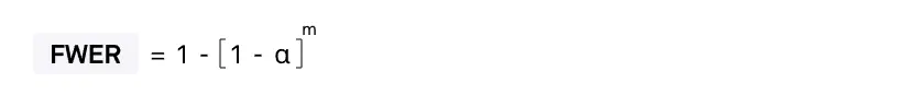 Так как в рамках многовариантного тестирования мы делаем несколько сравнений и можем допустить ошибку I рода несколько раз, FWER показывает вероятность совершить ее хотя бы единожды и рассчитывается по формуле: