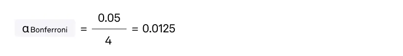 Предположим, мы хотим одновременно протестировать 4 версии одного и того же элемента на странице. Имеем α = 5%, β = 20%, количество гипотез = 4. Вроде, никаких проблем. Но на деле оказывается, чем больше гипотез мы проверяем, тем выше риск получить ошибку I рода. Так, в нашем случае ее общая вероятность (FWER) будет следующей: