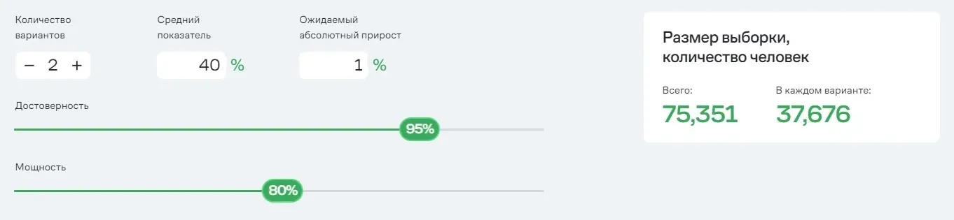 - Заранее определить размер выборки для теста (ранее в чек-листе мы сделали это на 4-м шаге). Такие данные будут ориентиром для понимания, сколько ещё тест должен продлиться, чтобы отследить реальное влияние на ключевую метрику.