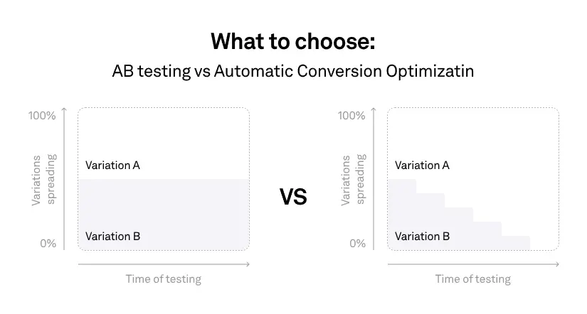 - Алгоритм добавляет больше гибкости эксперименту: переключение на более успешный вариант происходит автоматически ( не надо останавливать тест, как это случается в классическом A/B-тесте).