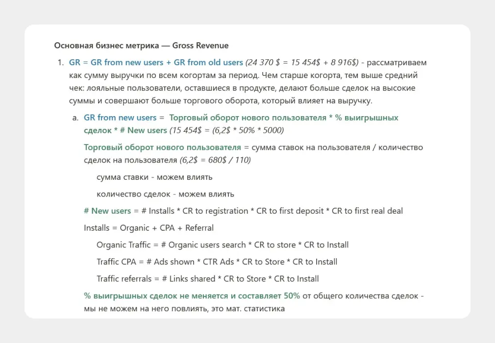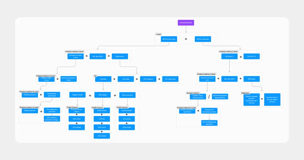 Чтобы упорядочить показатели, продакт-менеджер составляет иерархию метрик. Во главе этой иерархии находится ключевая метрика продукта, например регулярный ежемесячный доход. На неё не получится влиять напрямую, но продакт раскладывает её на другие метрики и находит то, на что повлиять можно.