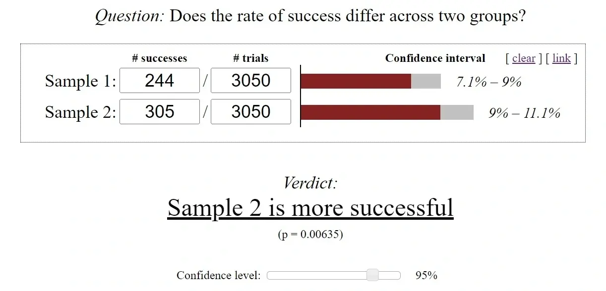 Так как мы определились с критериями точности теста, теперь можем определить размеры выборок, используя эти вводные. Для этого воспользуемся калькулятором Evan Miller: