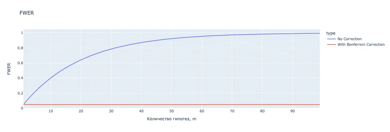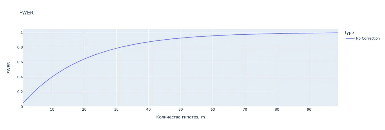 Так как в рамках многовариантного тестирования мы делаем несколько сравнений и можем допустить ошибку I рода несколько раз, FWER показывает вероятность совершить ее хотя бы единожды и рассчитывается по формуле: